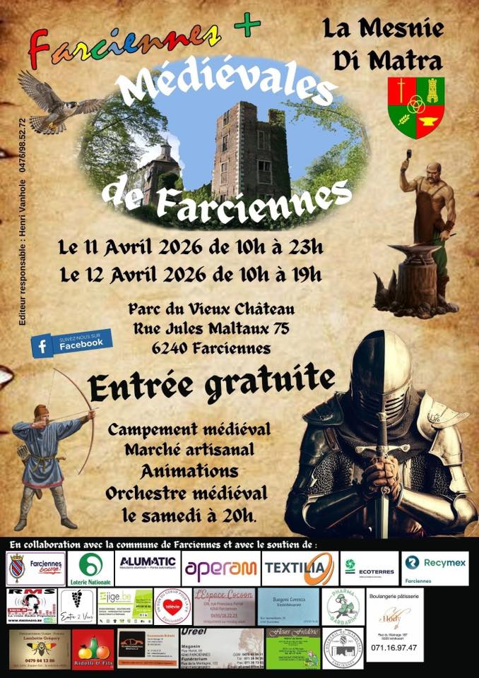 Les Médiévales de Farciennes t'invitent à faire un saut dans le temps le week-end du 11 et 12 avril 2026, au parc du Vieux Château. En franchissant les portes de cet événement, tu seras immédiatement transporté dans l'univers fascinant du Moyen-Âge. L'entrée est gratuite, ce qui te permet de profiter pleinement de tout ce qui t'attend.